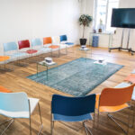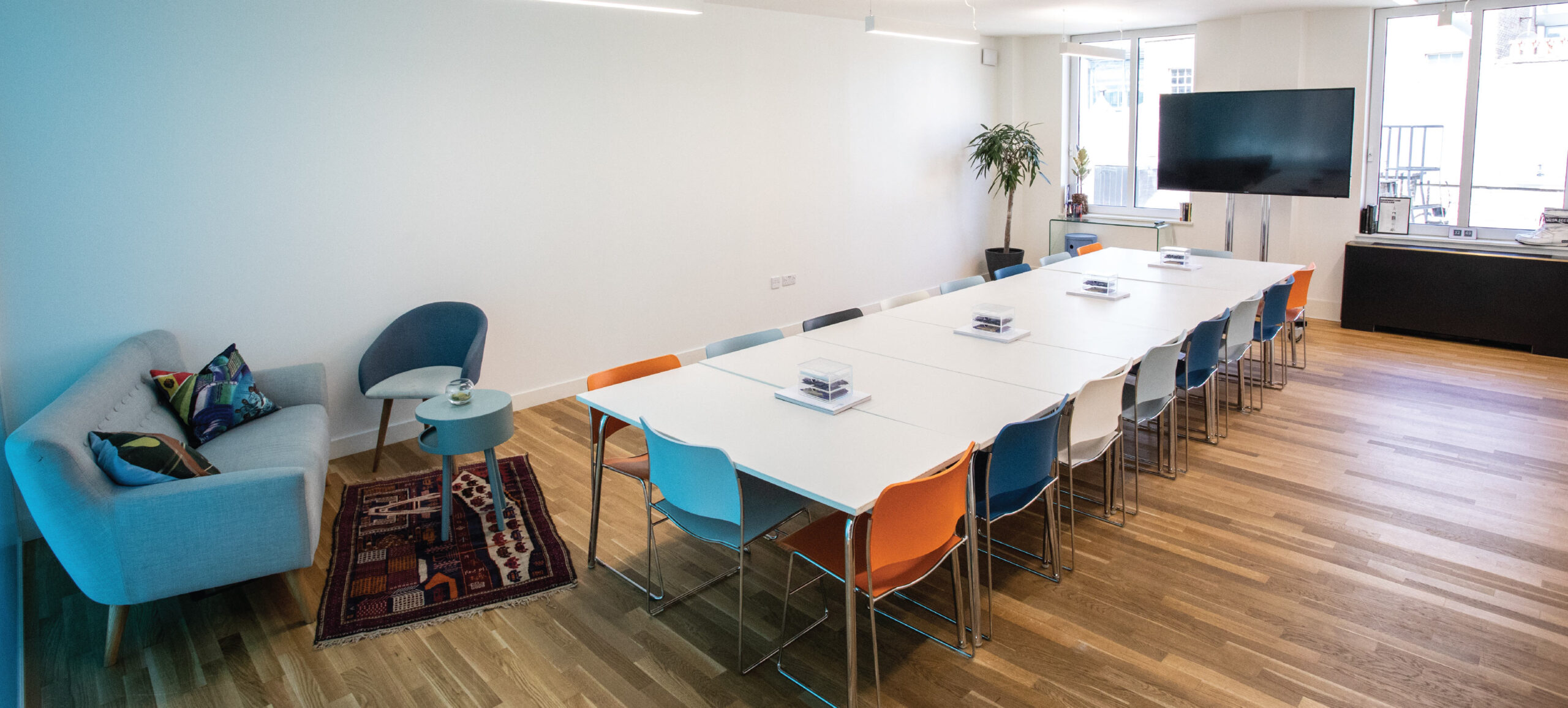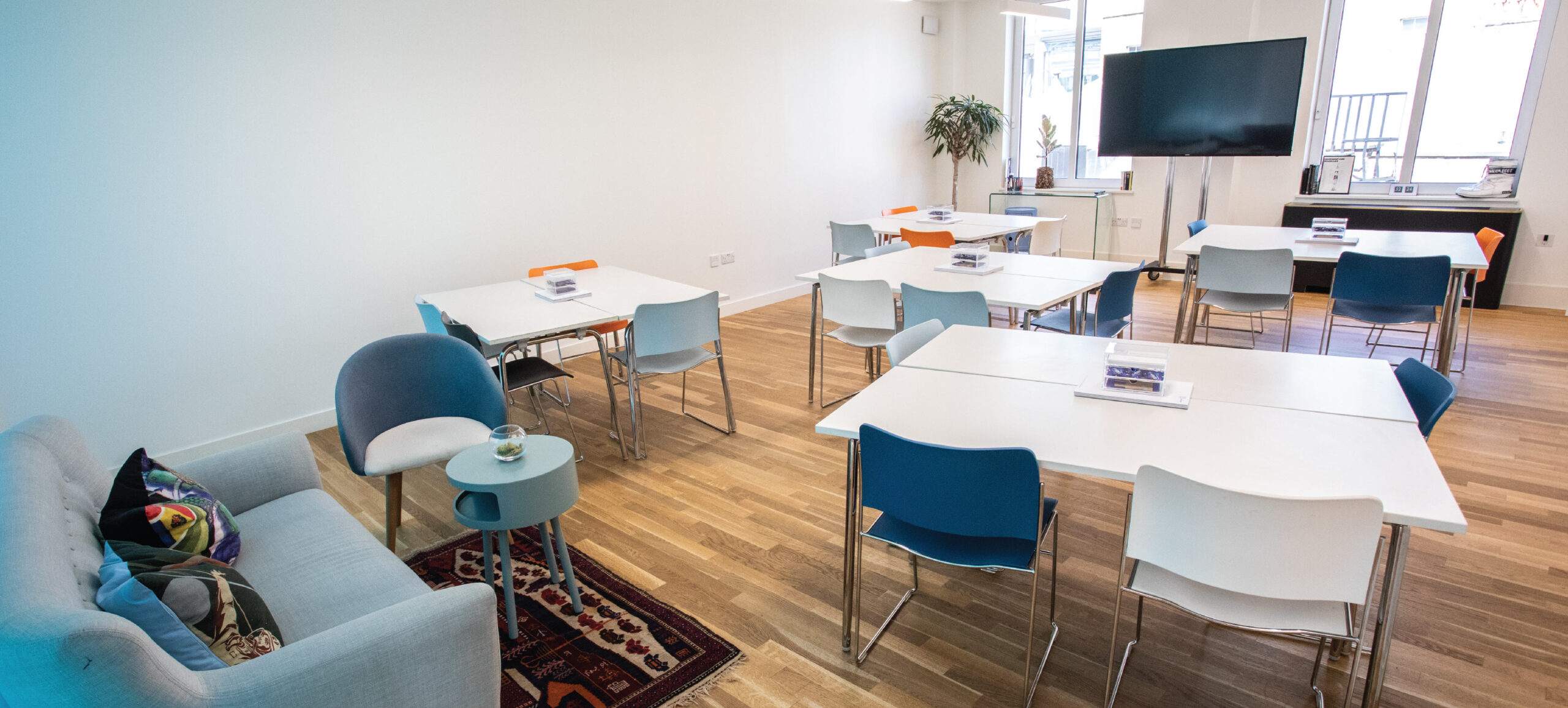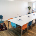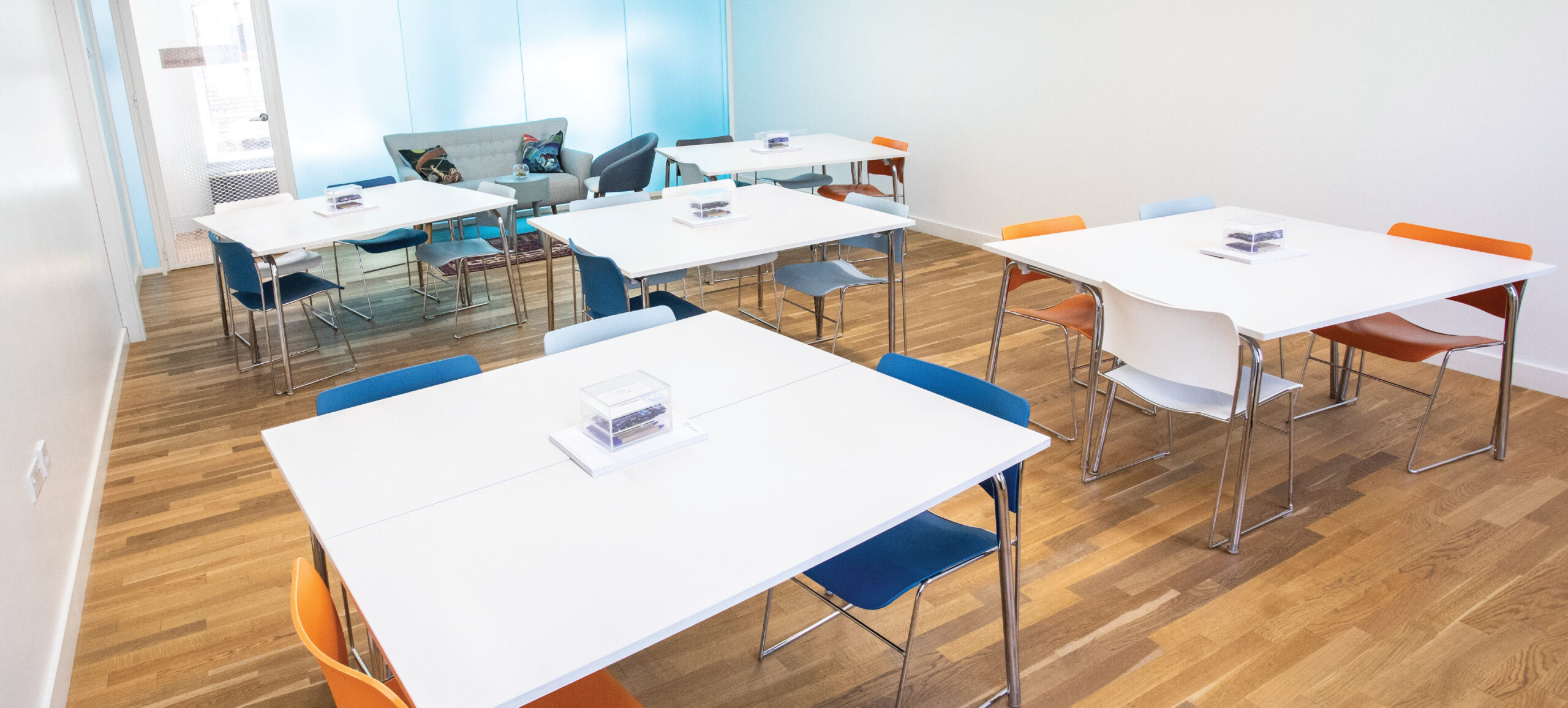 A great medium-sized room to workshop, meet or collaborate in. The blue walls give it a slightly lunar feel, making it calm, yet energising.